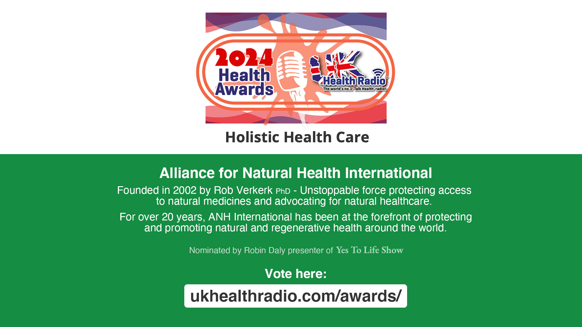 • The ANH International team are delighted to have been nominated for an award by ANH friend, Robin Daly of the Yes to Life Show, as part of the UK Health Radio awards, in the category of Holistic Health Care. We’d be honoured if you would consider voting for us in recognition of our work protecting and promoting natural health options. To vote click HERE. You will need to navigate to page 2 of the nominations and scroll down to the Holistic Health Care category.