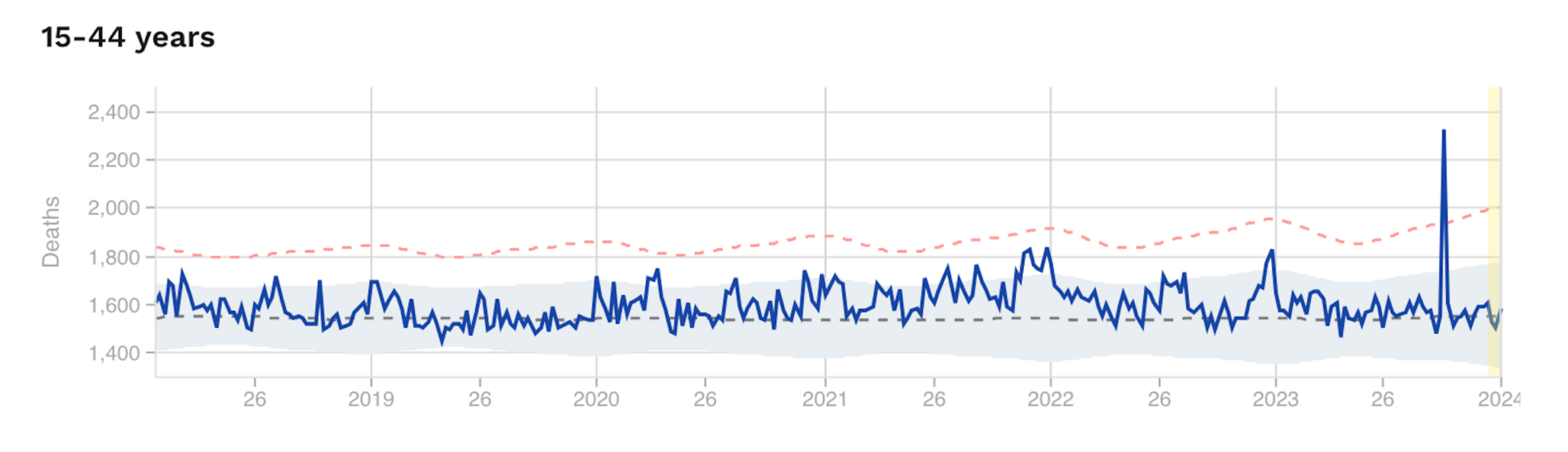 • This 2023 winter peak is close to the peaks during the first two key pandemic years of 2020 and 2021 (Fig. 1). Like the UK data, there are some disturbing peaks across all ages, including the youngest age group, 15 to 44 years, which shows a peak in late 2023 that is entirely missing in any previous year, including during the March 2020 to May 2023 ‘pandemic’ period (Figure 2).