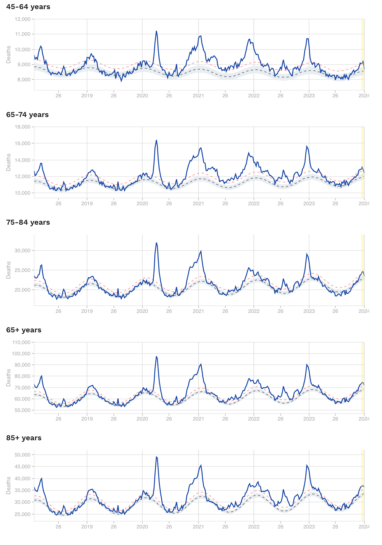 • In the older age groups, the same winter 2022/23 peaks are seen (Fig. 3), these all contributing to the pattern seen across all ages (Fig. 1). Again, the early 2023 peak is not dissimilar to those of the early pandemic years of 2020 and 2021.