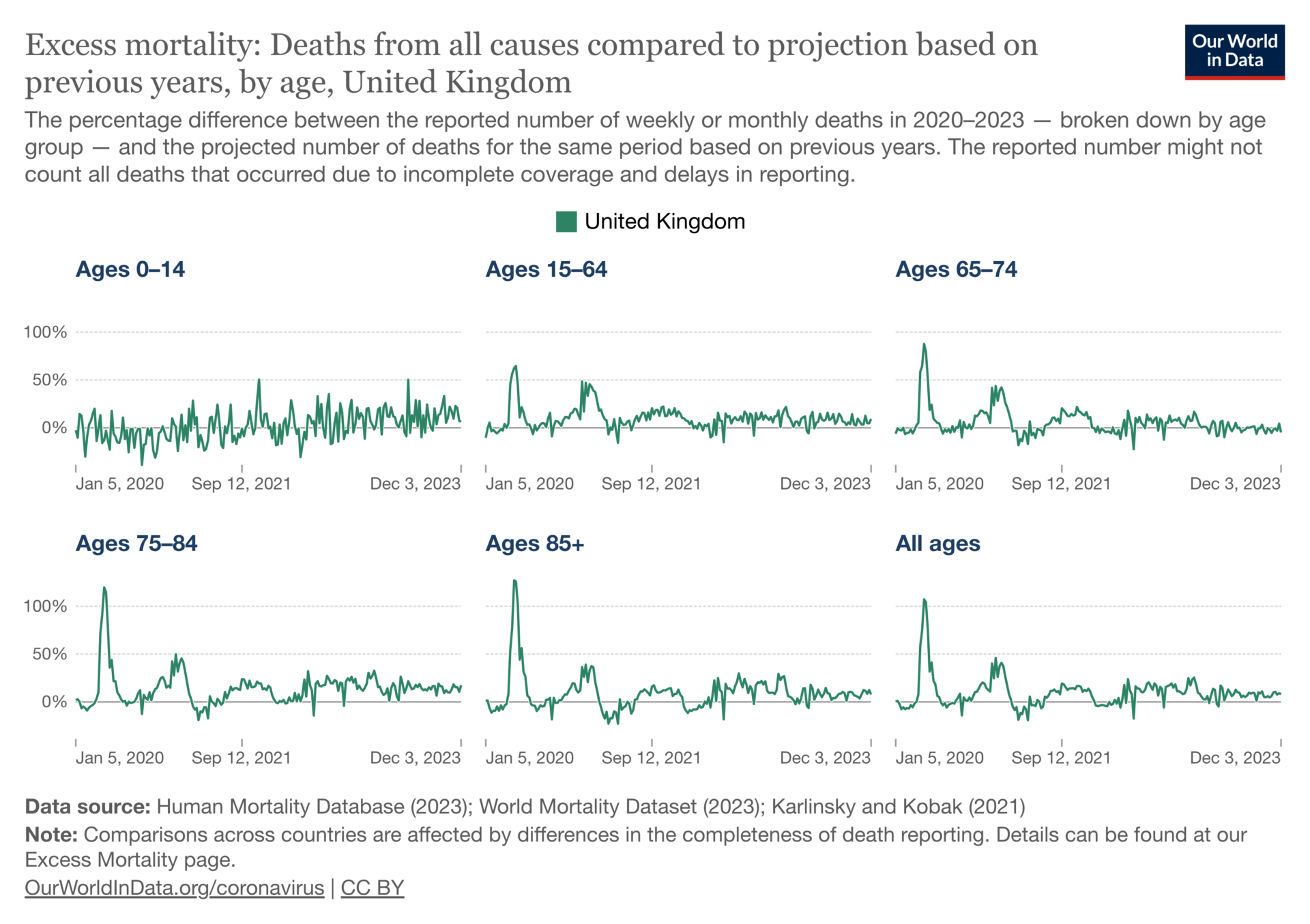 Figure 4. Excess mortality in the UK across various age groups, based on P-scores. Source: Our World in Data.