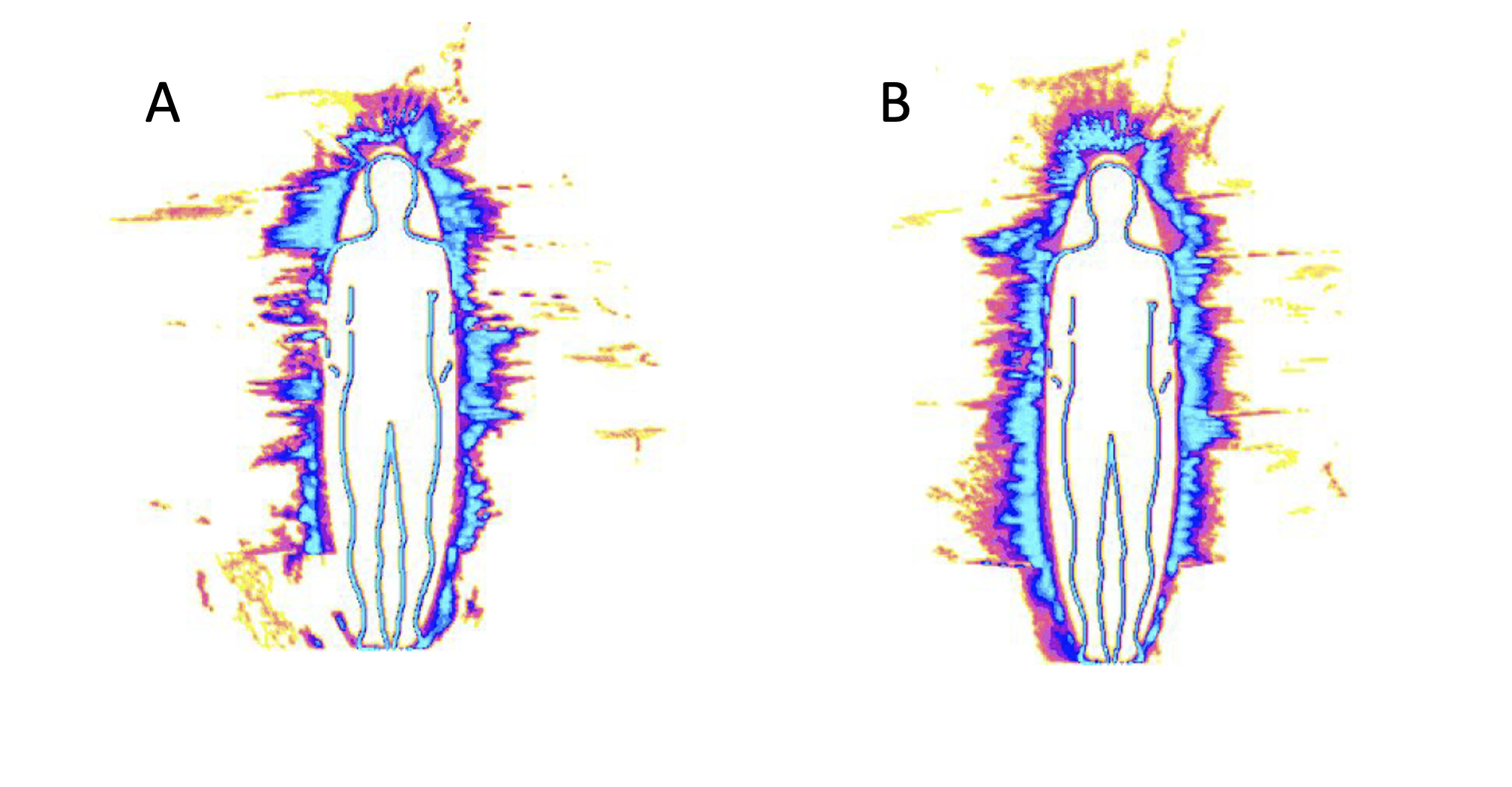 Figure 3. Composite aura for normal healthy female (50) before (A) and after (B) administering therapeutic touch therapy. Image from part of a range of studies undertaken by Dr Konstantin Korotkov as summarised in a book chapter by Beverley Rubik PhD of the Institute for Frontier Science (Oakland, California).